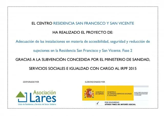 La Residencia San Francisco y San Vicente continua con la implantación del programa NoSujetes desarrollado por Dignitas Vitae y Lares Comunidad Valenciana gracias a la subvención concedida por el Ministerio de Sanidad, Servicios Sociales e Igualdad con cargo al IRPF 2015